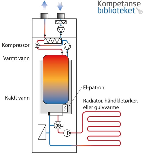 Figuren viser prinsippet for varmtvannsberedning med avtrekksvarmepumpe