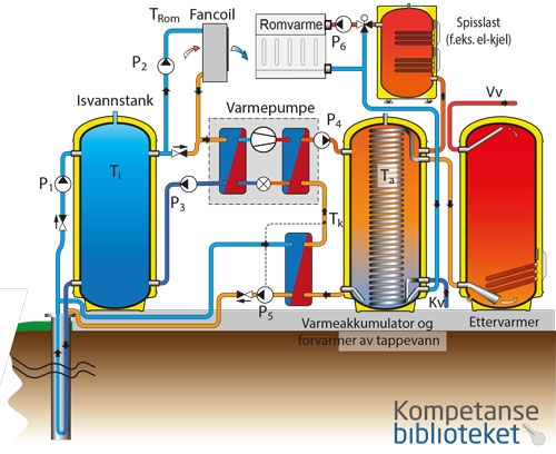 VARME: Akkumulatortanken har en innebygd varmeveksler som er en rørspiral (coil). Kaldt tappevann blir forvarmet i varmeveksleren og ettervarmet i en bereder. Akkumulatortanken får dermed to funksjoner; akkumuleringstank for varmepumpen og forvarming av kaldt tappevann. Temperaturen i akkumulatortanken reguleres etter utekompenseringskurve (fyringskurve). Når bygget ikke har varmebehov, kan Ta heves til for eksempel 50 °C (eller hva varmepumpen klarer) for å forvarme kaldt tappevann mest mulig. Varmepumpen er en såkalt væske/vann-varmepumpe som her henter varme fra energibrønn og eventuelt fra kjøleavgiverne.
