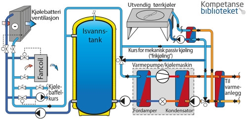 Figur 1. Prinsippskisse av vannbårent isvannsanlegg for passiv og/eller aktiv mekanisk kjøling.