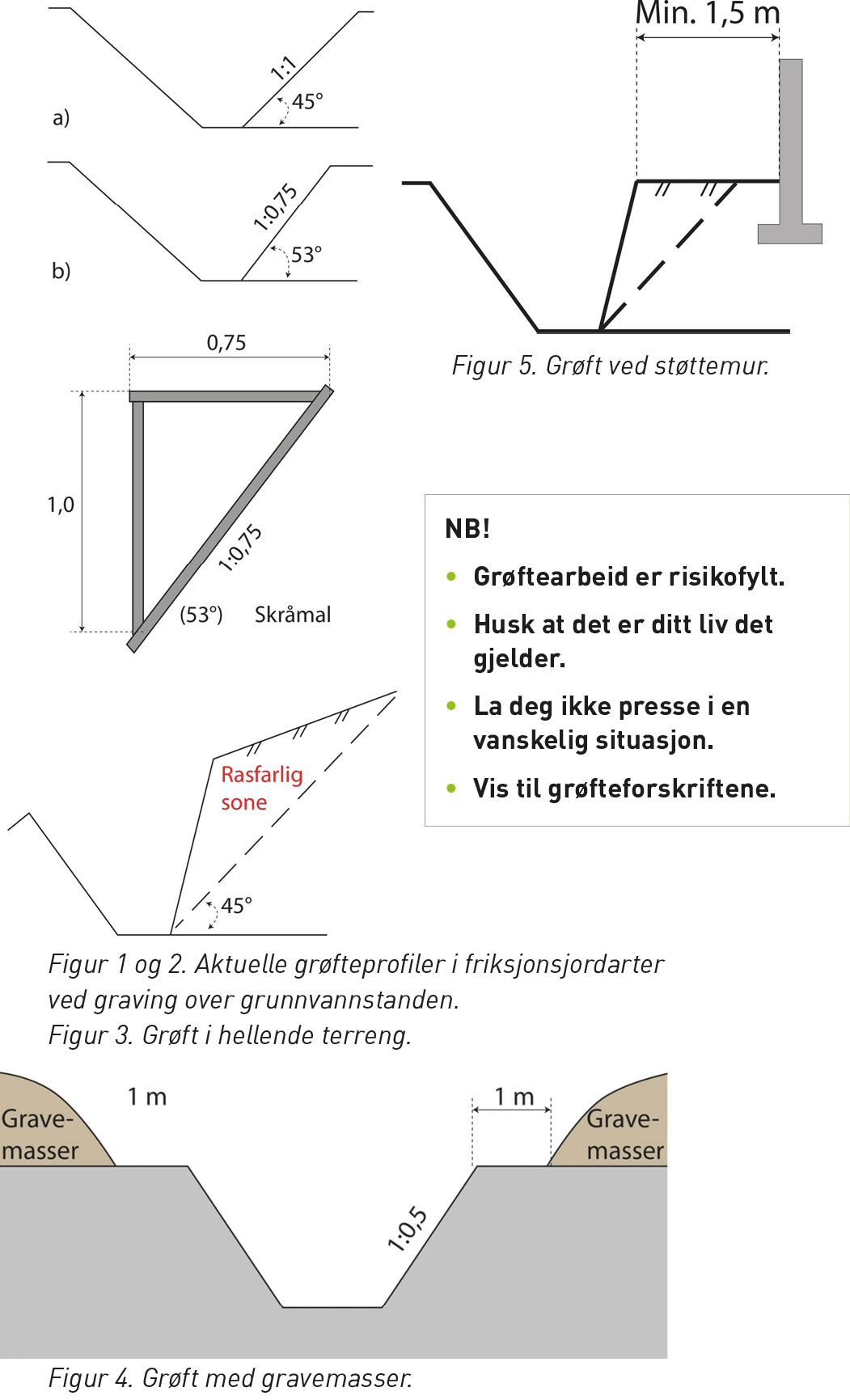 - grøftesidene i jordgrøft skal ha helling på 1:1 (45°) eller maks 1:0,75 (53°) dersom grøfta skal fylles igjen i løpet av dagen