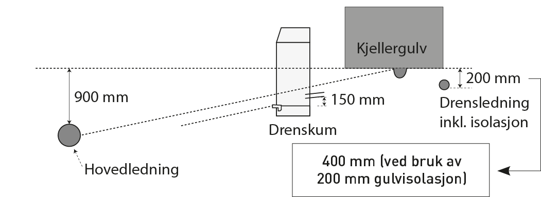 - Mellom innvendig topp på hovedspillvannsledning ved forgreningen og vannstand i nederste vannlås (eller kjellergulv) skal det være minimum 900 mm.