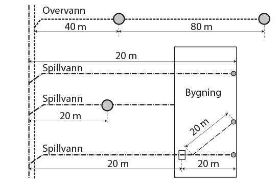 - For utvendige spillvannsledninger skal det være maks. 20 meter fra hovedledning til stakepunkt og maks. 40 meter mellom kummene.
