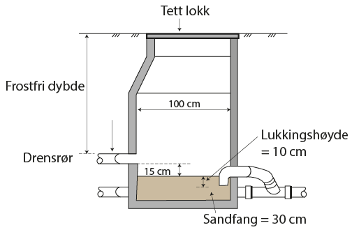 - Drenskummer og overvannskummer skal ha sandfang på minimum 300 mm og en lukningshøyde på vannlåsen = 100 mm.