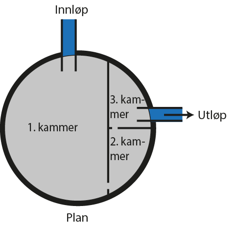 Materialtekniske krav skal oppfylles i henhold til NS 3162. En slamavskiller brukt til bolig med WC skal ha tre kamre. Til fritidsbebyggelse er det nok med 2 kamre. Kamrene skal forbindes med hverandre med 110 mm rør eller tilsvarende åpninger. Avløpet fra det siste kammeret skal være dykket minst 30 cm under vannflaten. For store anlegg må kammerne bygges opp som en seriekopling av tanker, eksempelvis et første kammer betående av en tank på 24 m3 og en tank på 16 m3 delt i to kamre. Ekstra store anlegg må ha parallellkoplede førstekammer-tanker og seriekoplede annen- og tredjekammer-tanker.