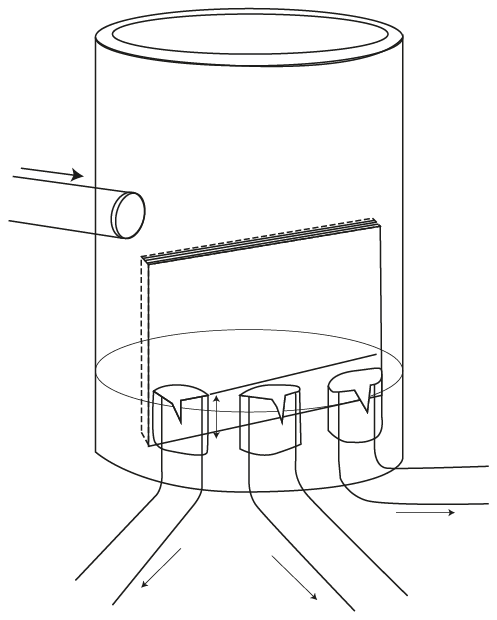 - en kum med skillevegg og utløpsrør med justerbare V-overløp