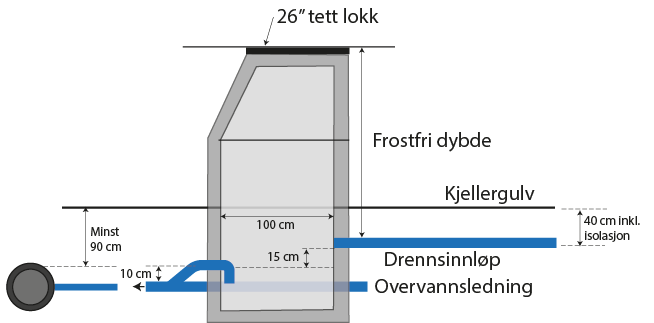 Normalreglementet forlanger en høydeforskjell på 90 cm mellom topp hovedledning og kjellergulv ved felles uttrekk. Det vil si at kjellergulvhøyden, etter dette må være minst 120,30 + 0,90 = 121,20.