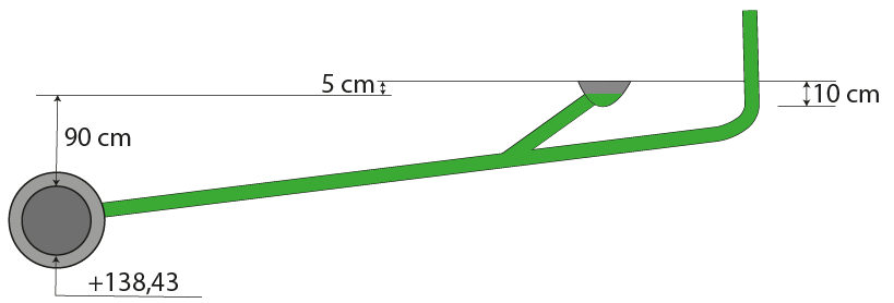Normalreglementet forlanger en høydeforskjell på 90 cm mellom topp hovedledning og vannstanden i lavest liggende sluk (vannlås). Normalt er det ca. 5 cm fra vannstanden i sluket til overkant kjellergulv. Det vil si at kjellergulvhøyden etter dette må være minst 138,63 + 0,05 + 0,90 = 139,58.