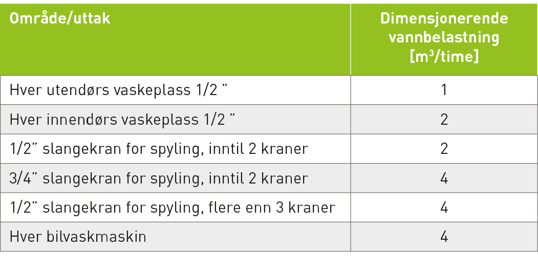 Størrelsen av oljeutskilleren og sandfanget bestemmes ut fra dimensjonerende vannbelastning som er summen av vannforbruket som skal ledes via utskilleren. Overlat dimensjoneringen til leverandøren av utskilleren. Tabellen angir størrelse på sandfang og våtvolum ut fra vannbelastningen ved bilvaskeplasser: