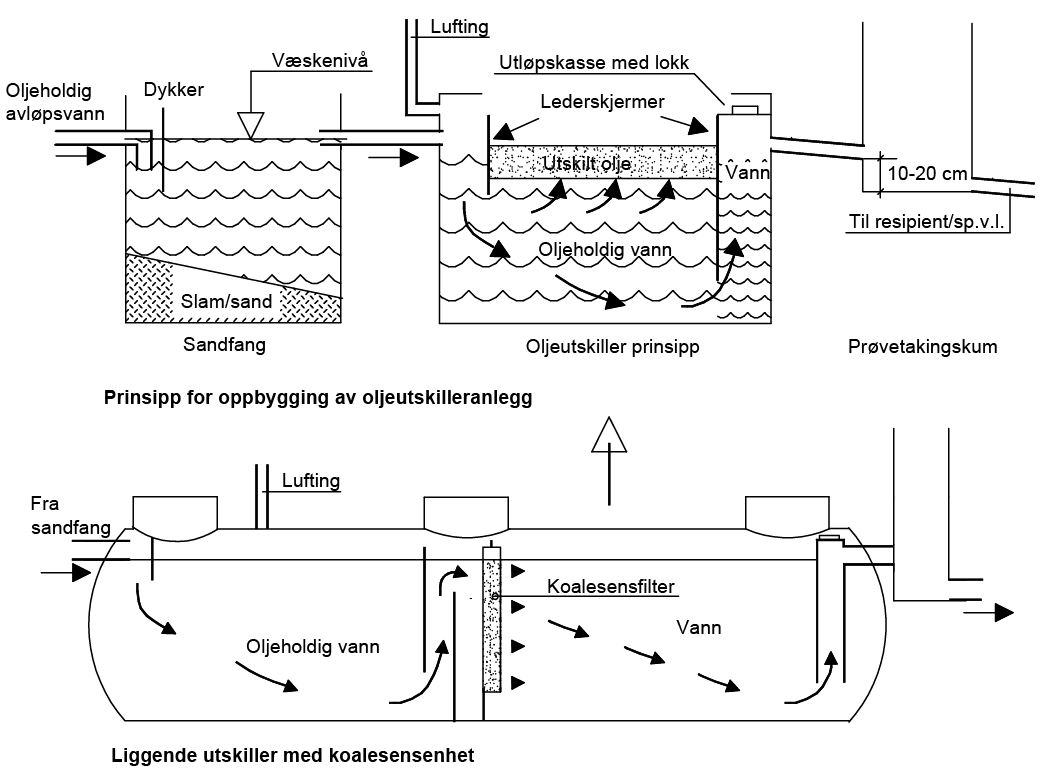 Oljeholdig avløpsvann skal alltid passere et sandfang e.l. renseinnretning med mulighet for måltaking før utslipp.