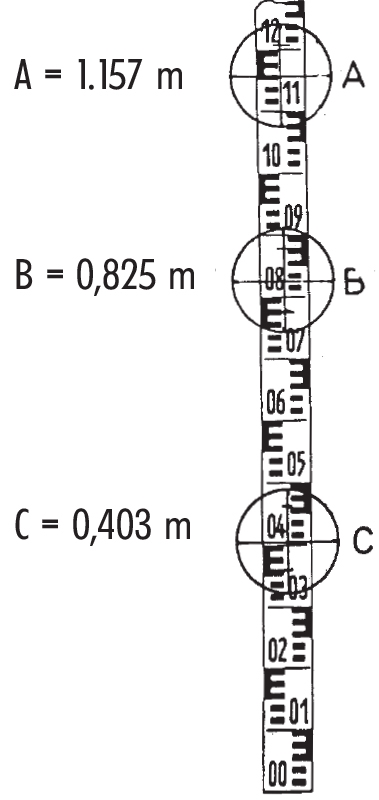 Nøyaktig nivellement krever at du leser av med tre desimaler. Hele meter og desimeter står på stanga. Centimeterne er vist 5+5 mellom desimeterne. For å finne millimeter, anslås trådkorsets plassering på centimeterstreken. Nedenfor er vist tre eksempler: