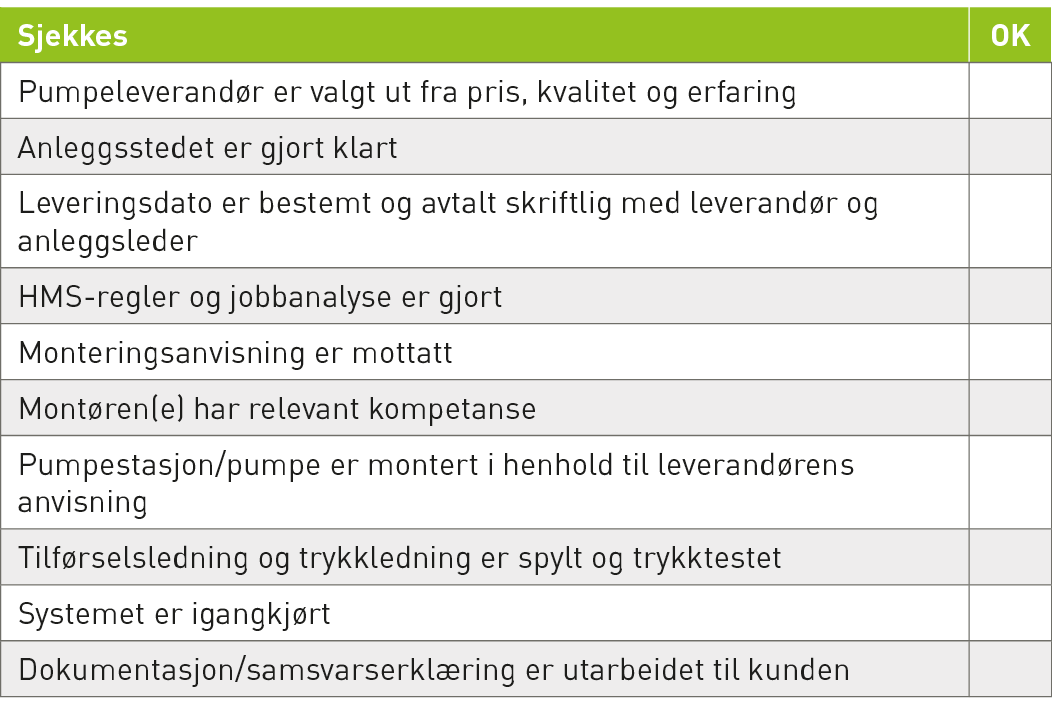 Pumpestasjon/pumpe er montert i henhold til leverandørens anvisning | |