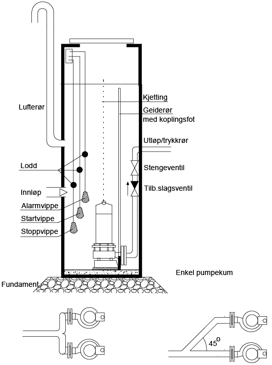 - Pumpene monteres med «vipper» dvs. flottører som starter og stopper pumpa og som sender en alarm ved for høy vannstand i sumpen.