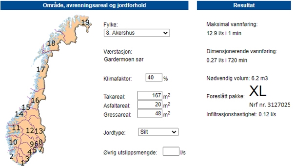 For små villaanlegg har Wavin laget en infiltrasjonskalkulator der du taster inn geografisk beliggenhet, avrenningsarealer og jordtype. Beregningene gir deg svar på maksimal vannføring, dimensjonerendevannføring, nødvendig magasinvolum, pakkeløsning og infiltrasjonshastighet. Beregningseksemplet viser data fra en større enebolig der takvannet ledes ut på et steinlagt område. Resultatet viser en XL-pakke som består av 16 kassetter. Kassettene kan stables i to høyder eller legges i to rader ved siden av hverandre, etter plassen som er til rådighet. Maksimum 5 kassetter kan stables i høyden. Minste høyde over magasinet skal være 60 cm. Større magasiner må beregnes av eksperter på området.
