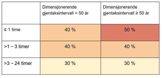 Med klimafaktor i denne sammenheng menes et dimensjoneringspåslag på 40 % med utgangspunkt i et 200 års gjentaksintervall.