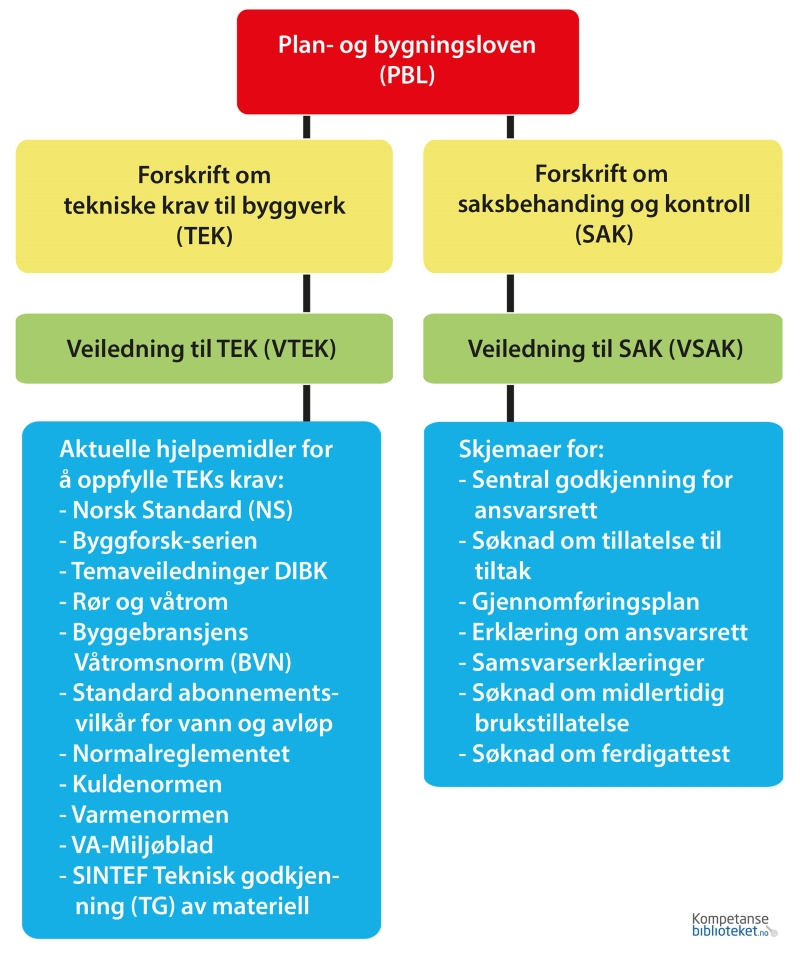 - Sentrale, statlige bestemmelser (lover og forskrifter med veiledninger, temaveiledninger, standarder og byggdetaljer - preaksepterte løsninger