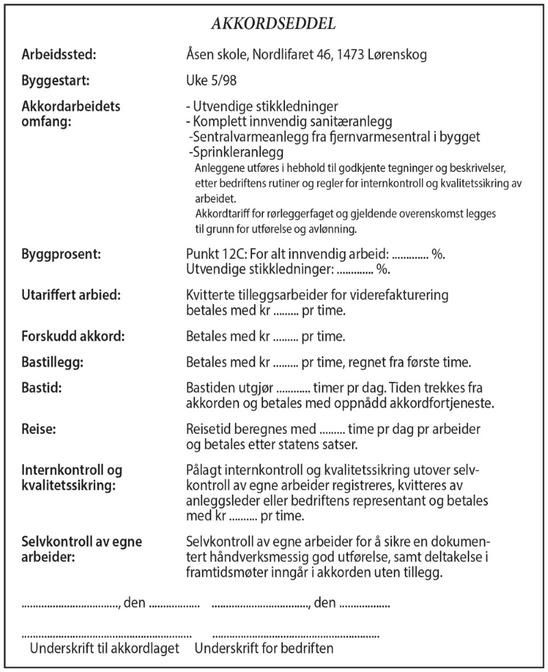 I henhold til Fellesoverenskomsten for byggfagene og iflg. vedlegg til Akkordtariffen for rørleggerfaget skal det skrives akkordseddel for alt arbeid som skal utføres i akkord.