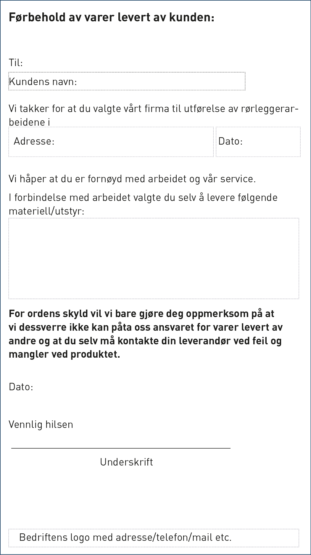 - Dersom rørleggeren anvender produkter levert av kunde uten å informere om risiko, overtar rørleggeren ansvar for monterte varer.