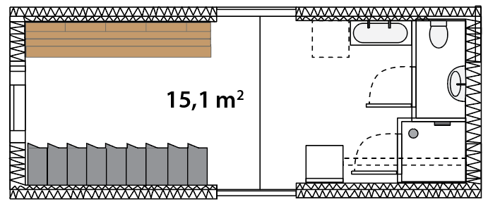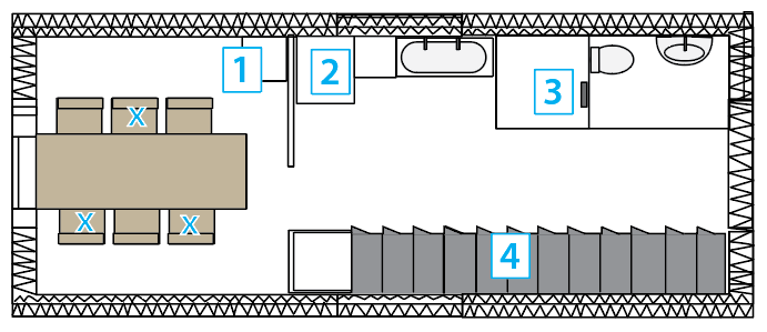 | Kombinert hvile- og sanitærrom: i denne brakken bør maks. 3 personer oppholde seg samtidig. |
