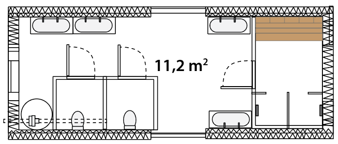 | Sanitærrom: i denne brakken bør maks. 3 personer oppholde seg samtidig. |