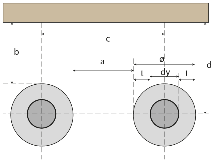 På neste side finner du en tabell som angir avstanden mellom senter rør i en rørgate og avstanden mellom rør og tak.