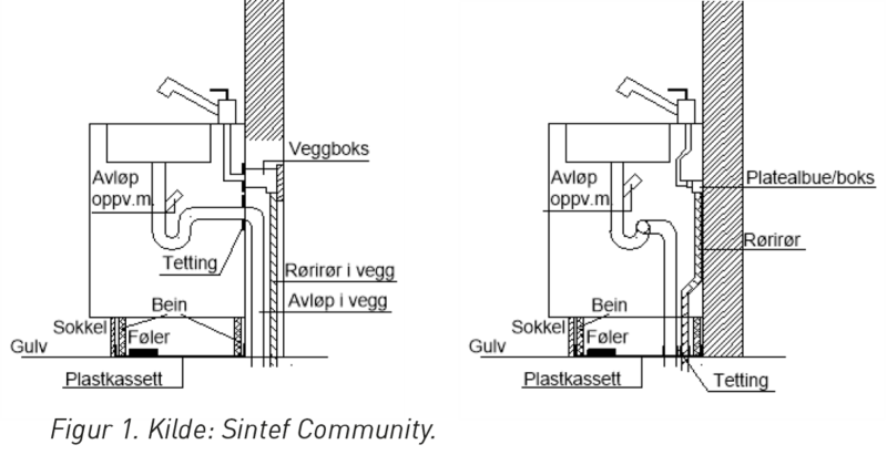 - Gulv under underskapene/kjøleskap/bak soklene skal sikres mot at lekkasjevann fører til følgeskade, ved montering av dryppbrett, membran, gulvbelegg eller tilsvarende