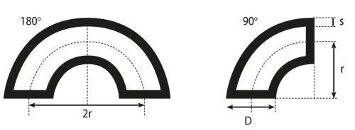 | DN | D utv. [mm] | D innv. [mm] | s [mm] | G [kg/m] | R [mm] | G [kg/m] | 2R [mm] |