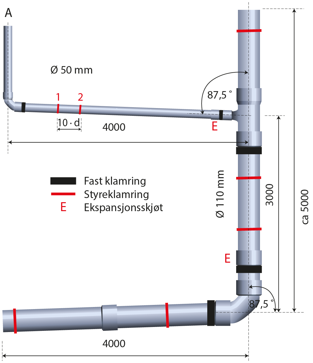 - Alle horisontale støpejernsrør skal understøttes ved opplegget. MA-rør må klamres godt ved liggende grenrør og bend.